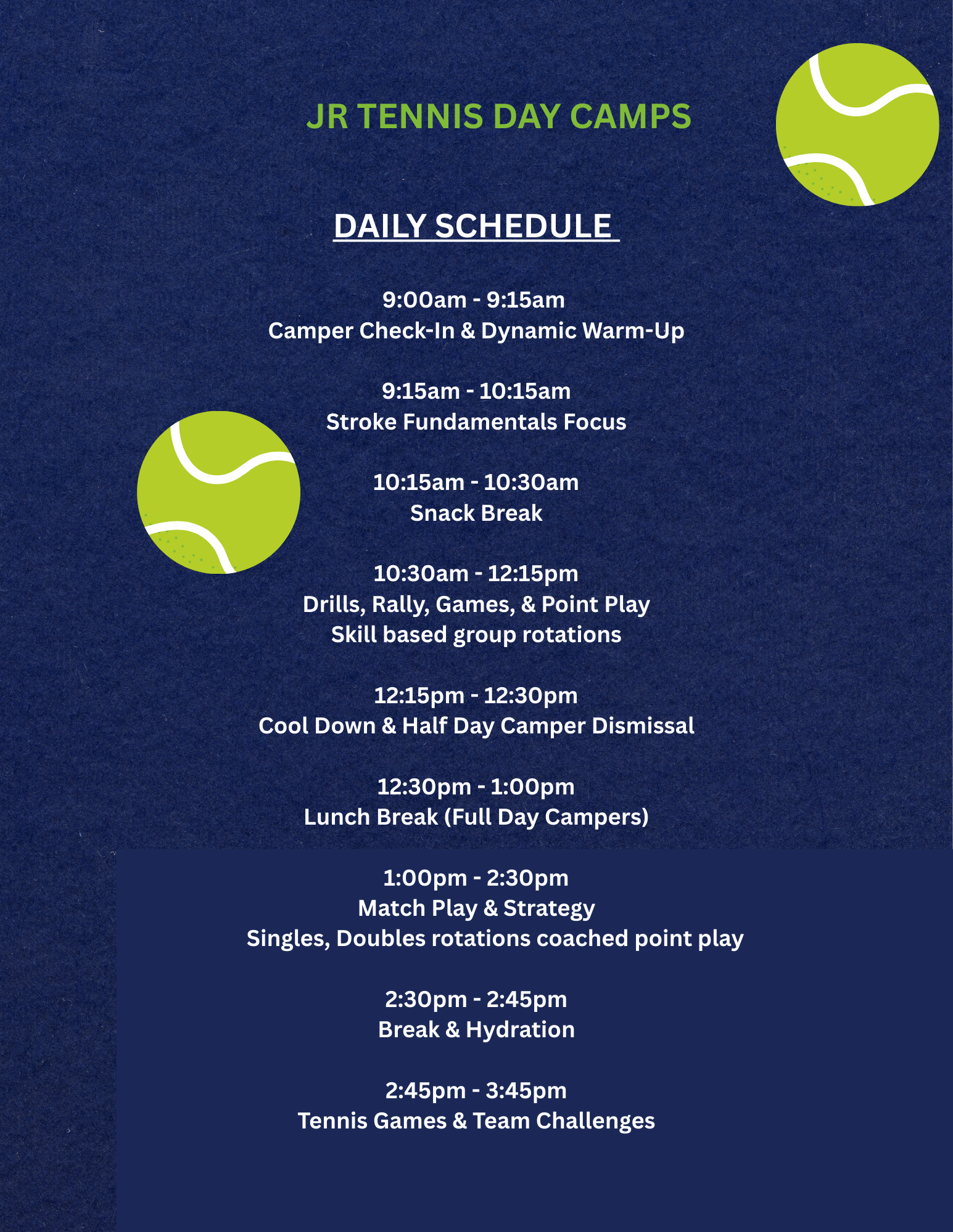 Take your teenager's tennis game to the next level! Advance strategy. Build skills. Compete with confidence. Our program uses a rally-based curriculum to sharpen fundaments and ball control—direction, height, depth, speed, spin—in a fun, competitive, and social environment. Each session features a daily theme that builds problem-solving, strategy, and tactical awareness, while also covering scoring formats and high percentage patterns of play. Players will develop both the physical and mental skills needed to succeed on the court! Level up and Sign up today!